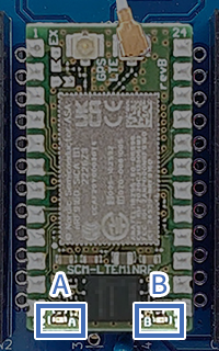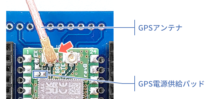 GPSアンテナはLTEモジュールの上部左側のコネクタに取り付けることができます(GPSアンテナは製品に付属していません)。GPSアンテナを接続する場合は図の位置(GPS電源供給パッド)をハンダでショートさせてください。GPSには3.3Vが給電されます。