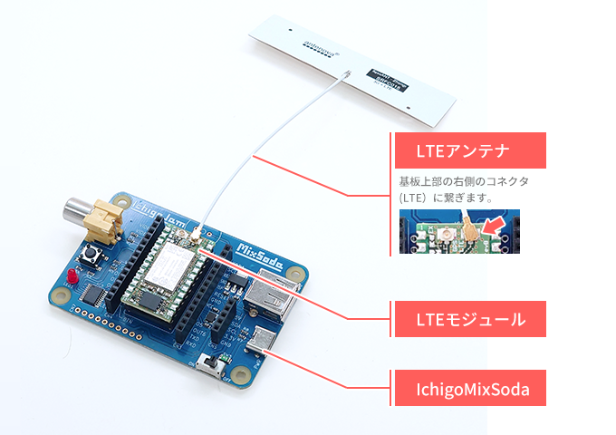 IchigoJamとMixSodaが一体になっているのでこのままお使いいただけます。中央にある緑の基板(LTEモジュール)上部右側のコネクタにはLTEアンテナを取り付けます。