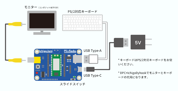 MixSodaに電源を入れているとき、IchigoJamボードのmicroUSB端子から電源を入れないでください。発熱、故障などの原因になる恐れがあります。 IchigoJamボードのmicroUSB端子にも電源を入れたい場合は、CN6のジャンパーピンを取り外してください。